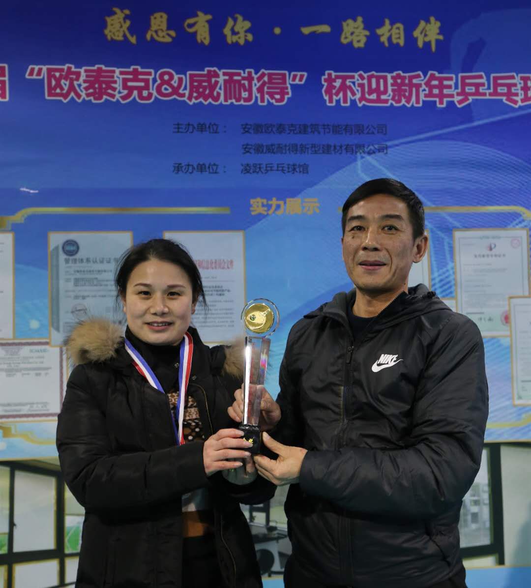 比賽開始后,大家迅速進入狀態(tài),爭奪十分激烈,球桌上不斷出現(xiàn)精彩對決,直拍、橫拍、扣球、旋轉(zhuǎn)球、弧線球等精彩扣殺、絕妙回擋精彩地呈現(xiàn)在賽場上。參賽選手們出色的球技、矯健的身姿、精彩的配合不時贏得陣陣掌聲與滿堂喝彩。本著“友誼第一、比賽第二、以球會友、切磋技藝”的原則,你來我往、互不相讓、展開了激烈角逐,通過淘汰賽、半決賽和決賽的爭奪,最終決出了冠亞軍。安徽威耐得董事長劉必武為獲獎選手頒獎并合影留念。